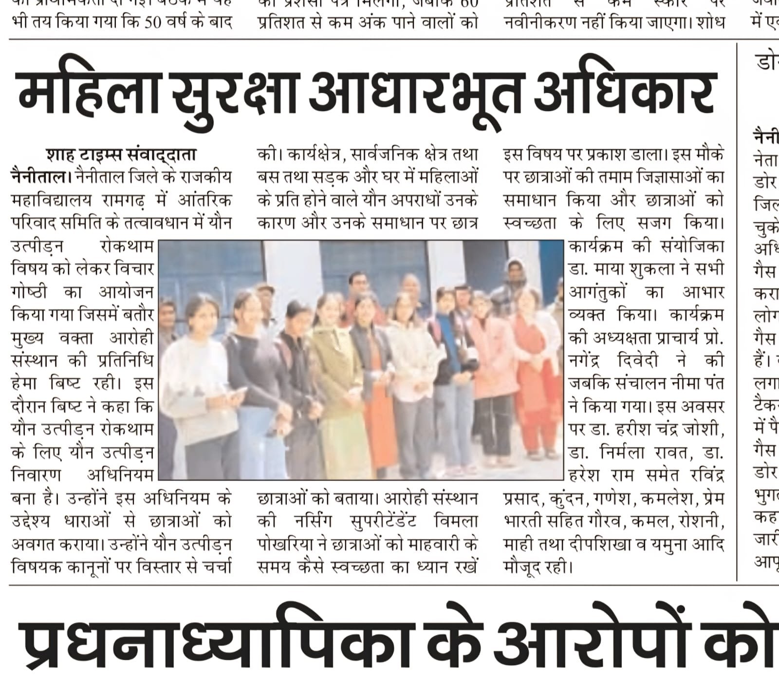 रामगढ़ महाविद्यालय में यौन उत्पीड़न रोकथाम पर जागरूकता गोष्ठी, छात्राओं को कानून व स्वच्छता की दी जानकारी