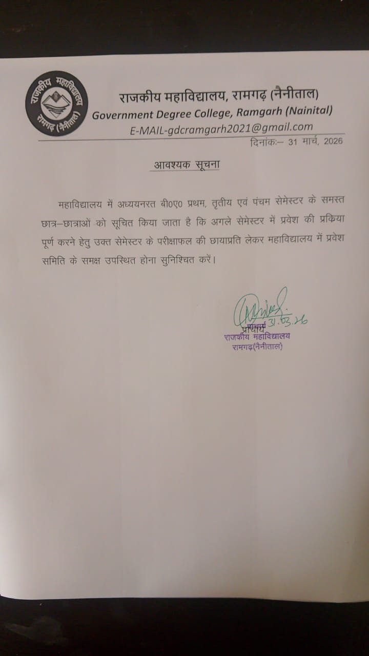 Government Degree College Ramgarh established in the year 2021 is affiliated to Kumaun University Nainital. Located in the Talla Ramgarh Block which is about Thirty-Five Kilometres from Nainital district, it is situated at an altitude of about 1789 meters. This institution has emerged as a beacon of hope for students who hail from rural region, providing them with access to higher learning. It currently offers courses in seven subjects: Hindi, English, Sanskrit, Economics, Political Science, Sociology and History.
